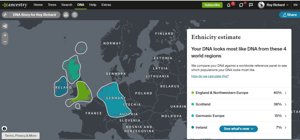 I had always believed that I was probably 99% English, so the results at first surprised me. 40% English, 38% Scottish, 15% Germanic Europe and 7% Ireland.